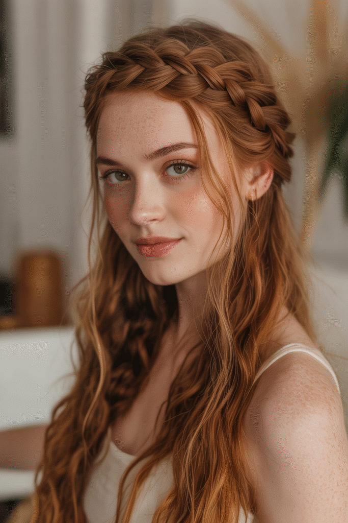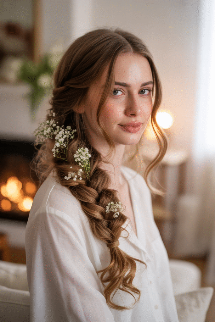 Start with loose waves, sweep everything to one side, and create a loose braid that drapes over your shoulder. The key? Don’t make it too tight. We’re going for “effortlessly romantic,” not “got caught in a wind tunnel.”