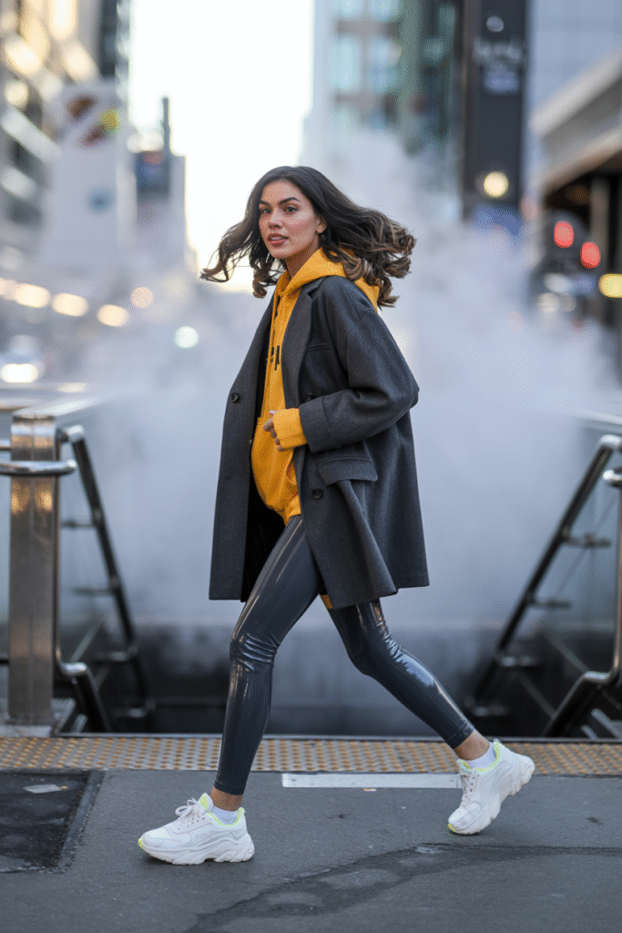 17) Boyfriend Coat + Hoodie + Leather-Look Leggings + Chunky Sneakers
