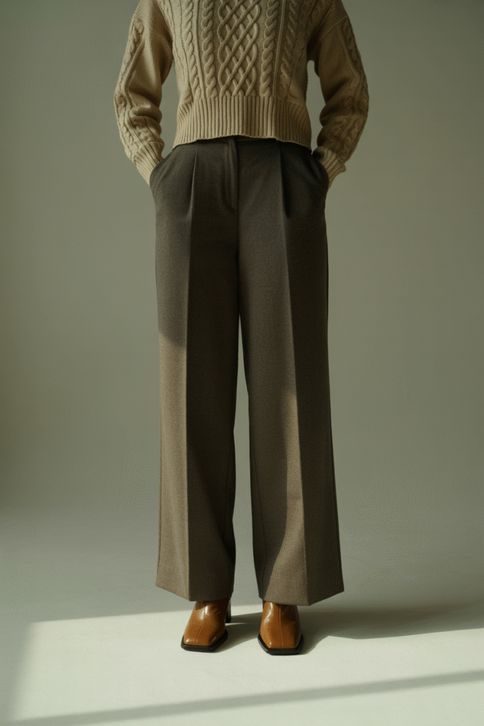 - Why it works: Monochrome camel-and-cream feels intentionally luxurious. The drape of wide-leg pants keeps the silhouette elegant.