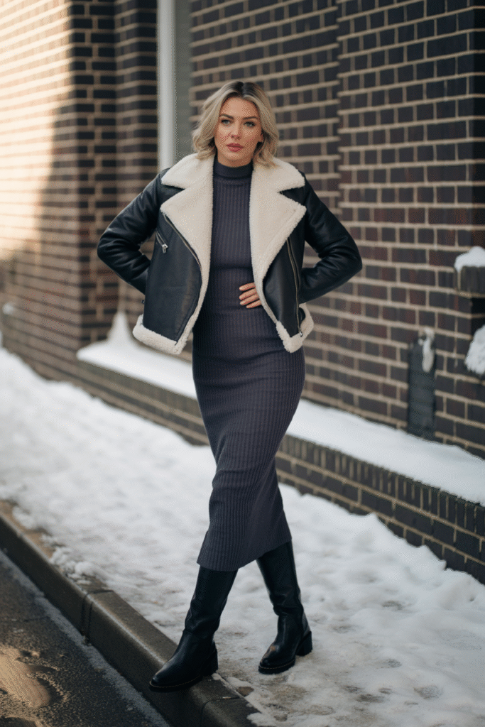 14) Shearling-Lined Moto Jacket + Knit Midi Skirt + Knee Boots