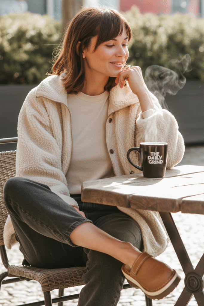 - Why it works: Off-duty ease with cozy texture feels effortless.
