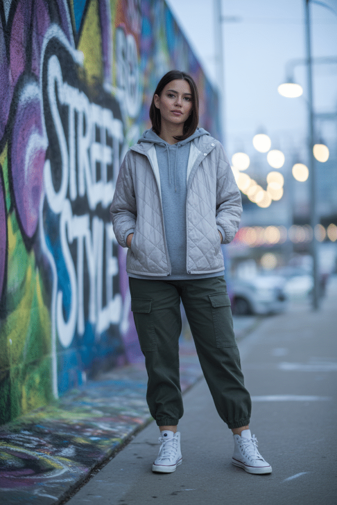 10) Quilted Liner Coat + Hoodie + Cargo Pants + High-Top Sneakers