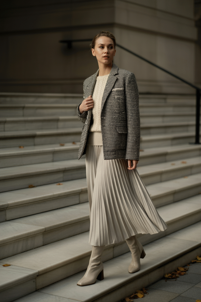 5) Tweed Jacket + Ribbed Knit + Pleated Midi Skirt + Block-Heel Boots