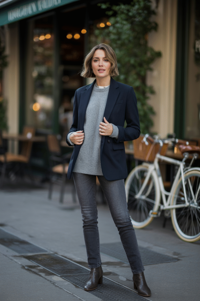 3) Tailored Blazer + Cashmere Sweater + Dark Denim + Ankle Boots