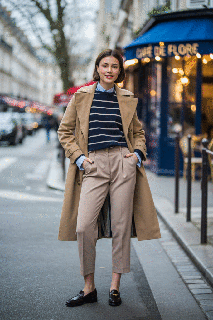 7) Wool Trench + Striped Sweater + Cropped Trousers + Loafers