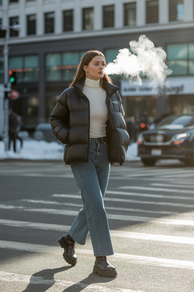 4) Puffer Jacket + Slim Turtleneck + Straight Jeans + Lug-Sole Boots