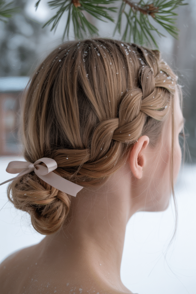 You want ethereal vibes for a winter brunch or low-key party. The waterfall braid frames the face and keeps everything soft.