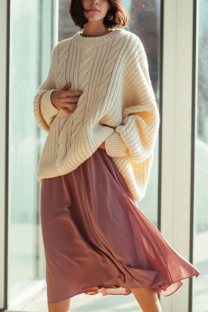 - Why it works: The chunky texture of the sweater balances the sleek, soft flow of the skirt. It looks like you tried—without actually trying.