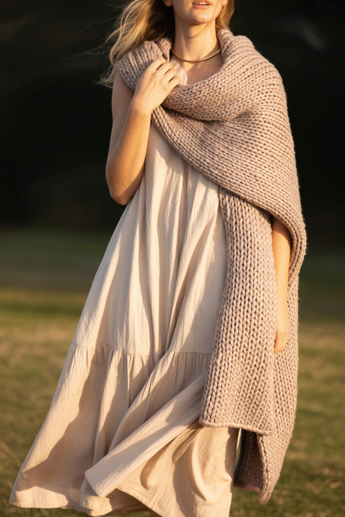 Take a breezy maxi dress from summer into fall with just one swap: add a chunky scarf.