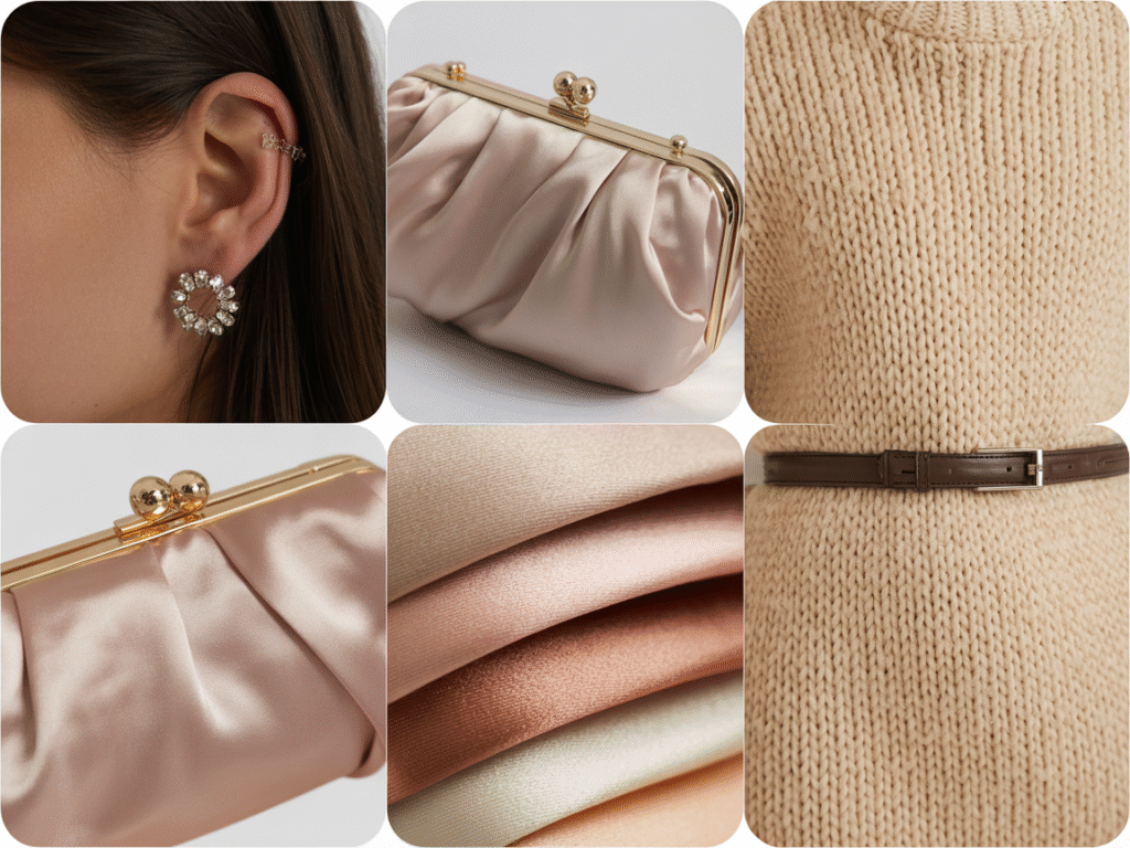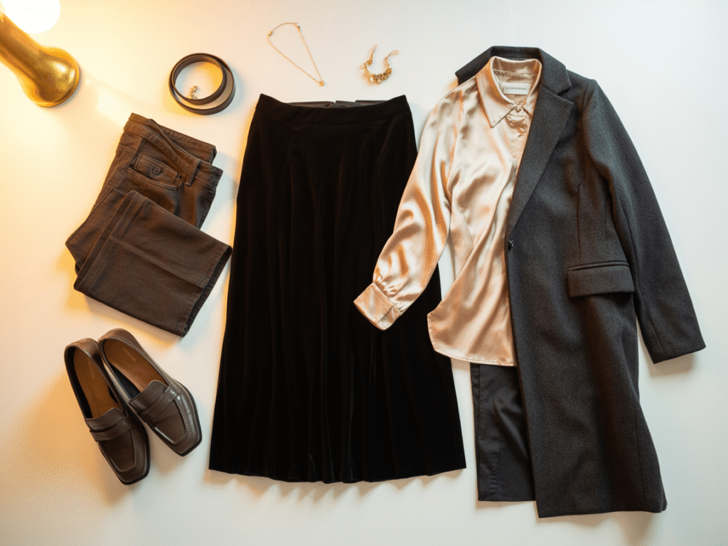 - Texture stack: velvet + satin + wool = depth without loud prints.