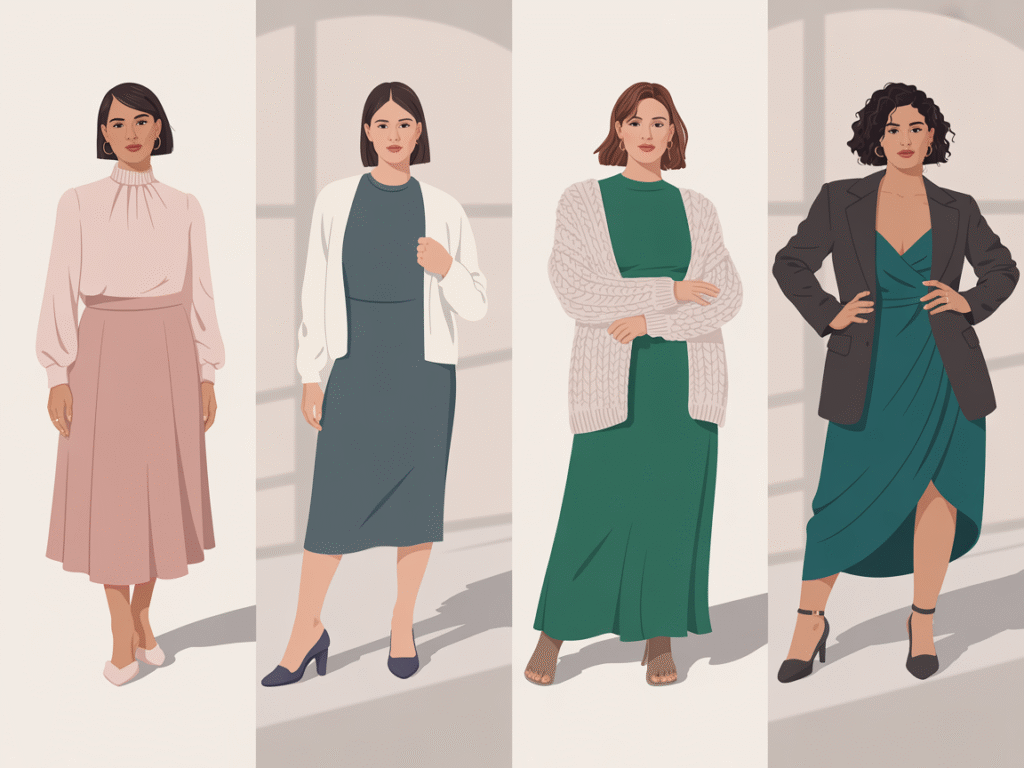 - Curvy: Use wrap silhouettes, structured blazers, and tummy-friendly mid-rise trousers. Place shine on the area you want to spotlight (shoulders, neckline).