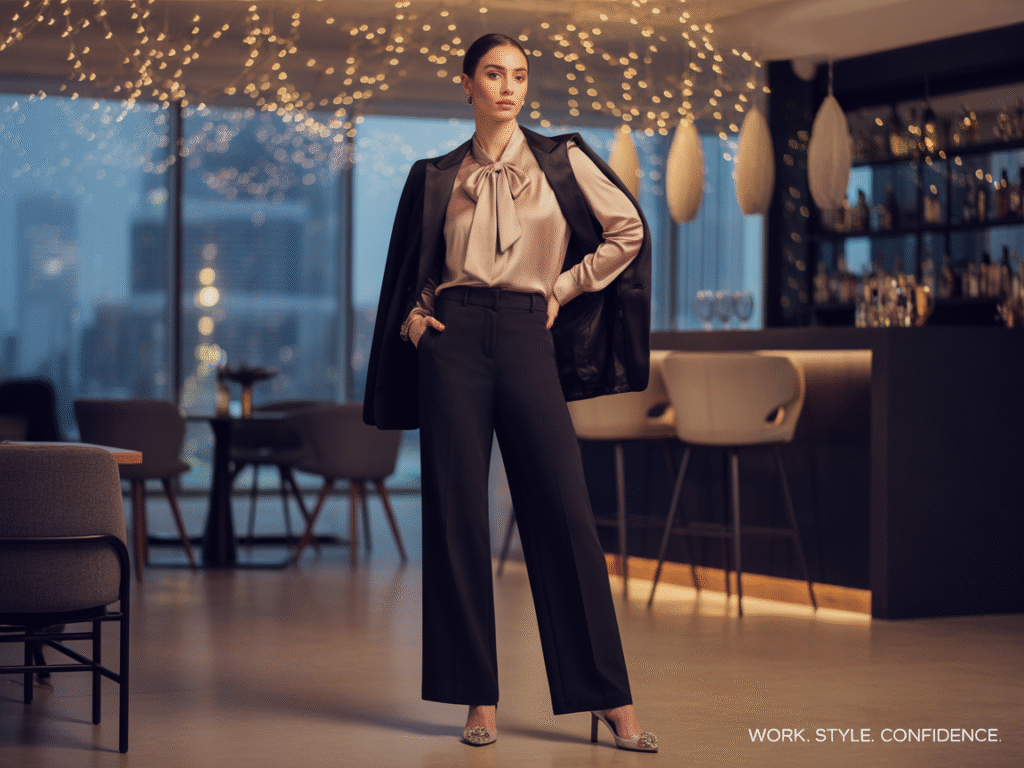 - Satin bow-neck blouse + pleated wide-leg trousers + kitten heels + blazer.