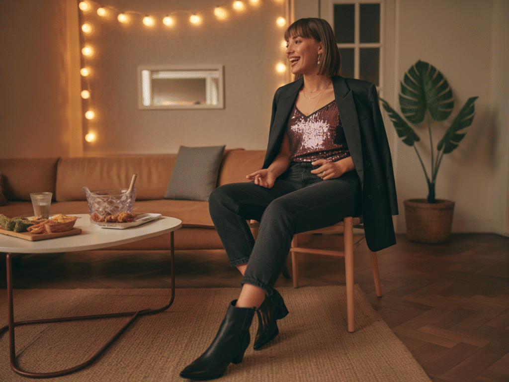 - Sequin top + dark jeans + pointed ankle boots + structured blazer.