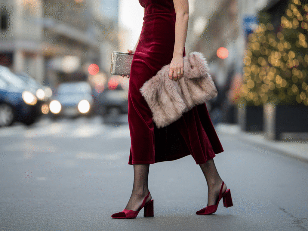 - Velvet midi dress + sheer tights + block-heel slingbacks + rhinestone earrings.