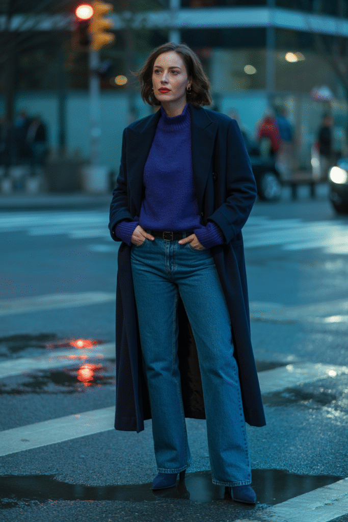 Formula: Navy maxi coat + midnight merino knit + indigo jeans or a navy skirt + polished sneakers or ankle boots.