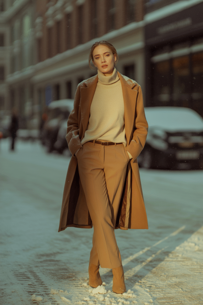 Formula: Camel wool coat + cream cashmere turtleneck + camel or beige tailored trousers + tan ankle boots.