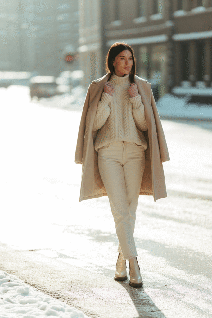 Formula: Off-white sweater + ecru denim or ivory tailored pants + cream coat + bone-colored boots.