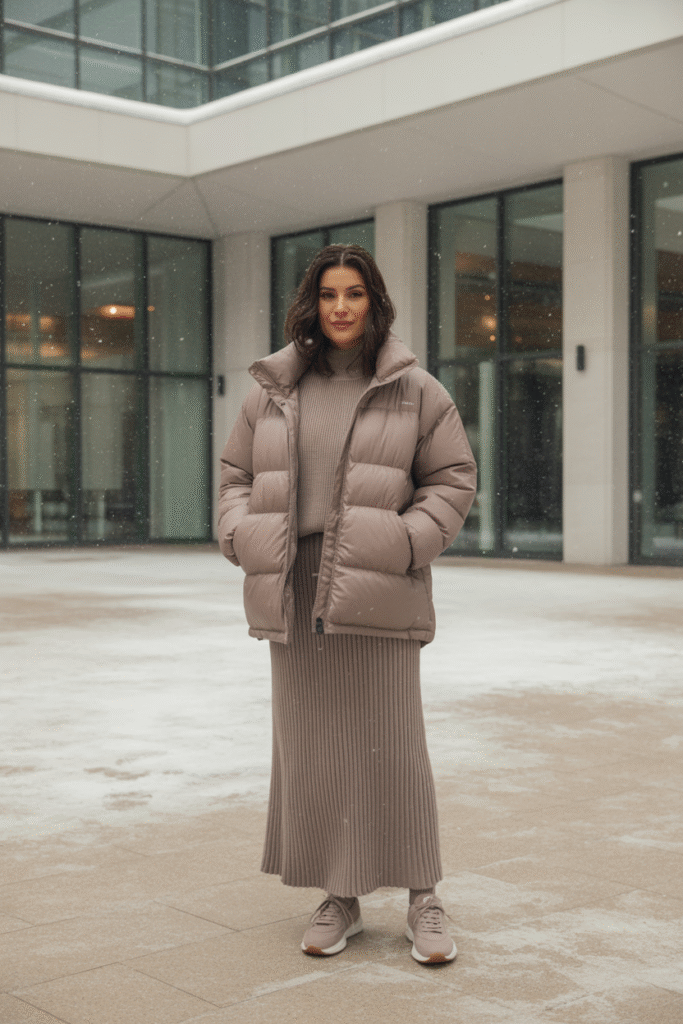 Formula: Taupe puffer + ribbed knit set (top + skirt or pants) in taupe + tonal sneakers or heeled boots.