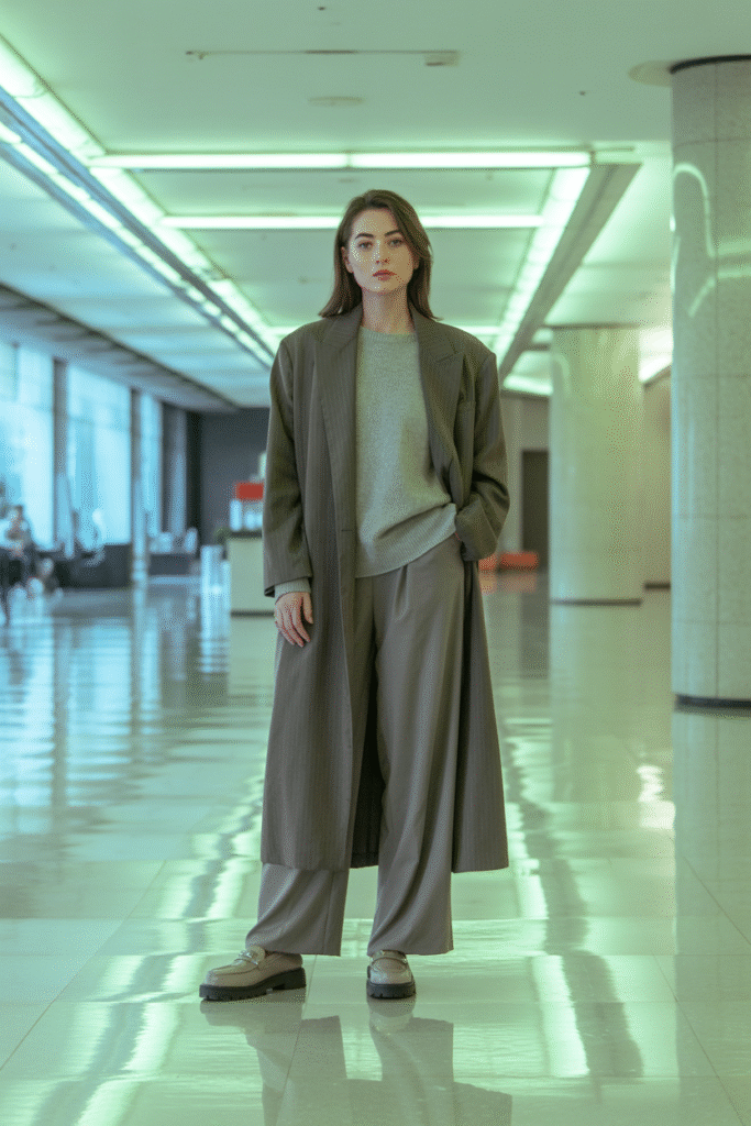 Formula: Longline grey blazer + soft grey knit + wide-leg trousers + chunky-sole loafers or ankle boots.