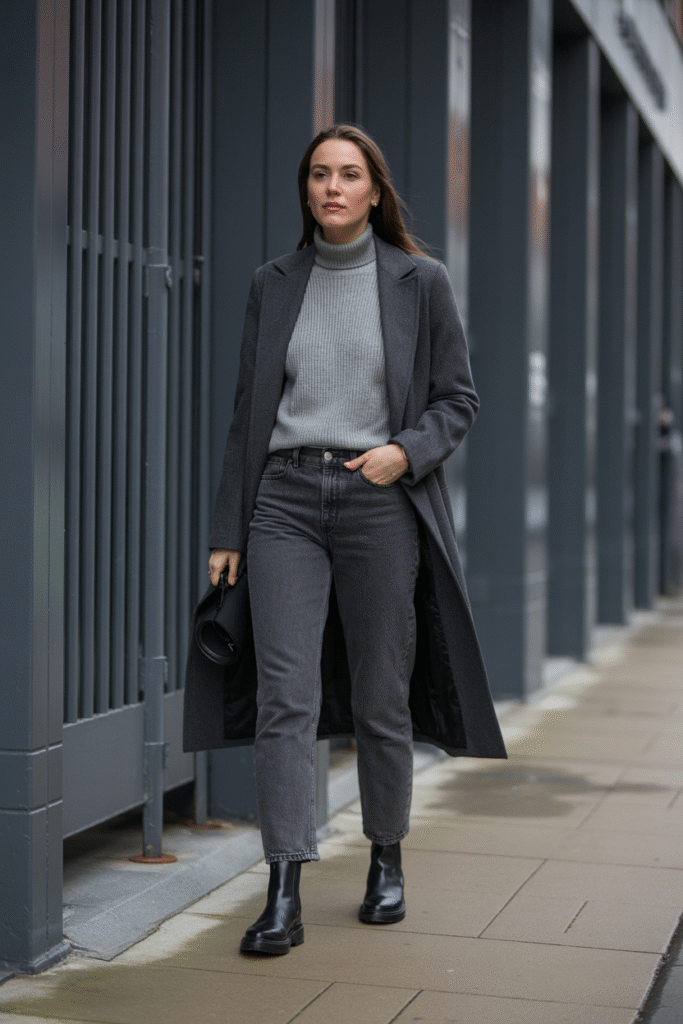 Formula: Charcoal wool coat + charcoal merino roll-neck + straight charcoal jeans + black Chelsea boots.