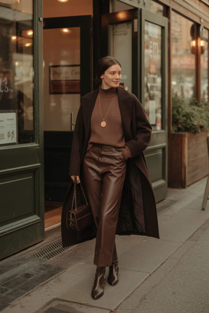 Formula: Chocolate wool coat + mocha knit + leather skirt or brown tailored pants + dark-brown boots.