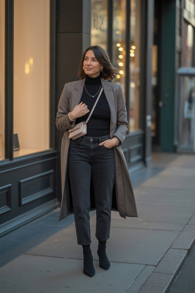 Formula: Dark jeans or ponte pants + merino turtleneck + tailored blazer or robe coat + sock boots + mini crossbody.