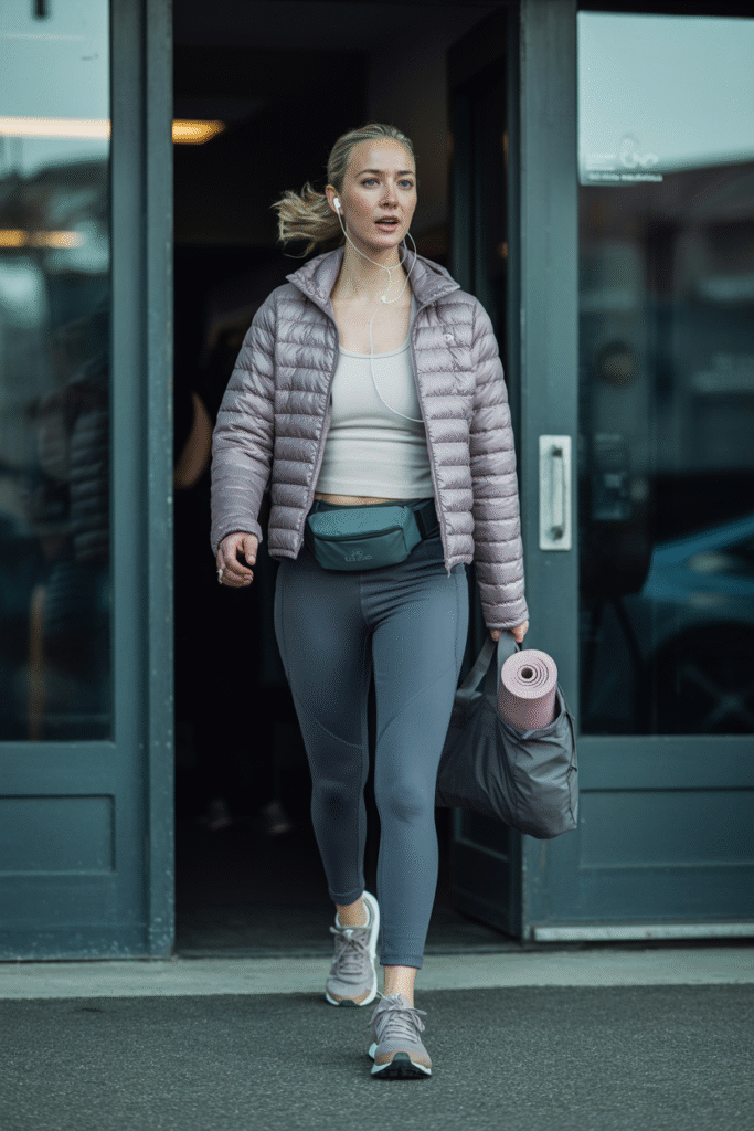 Formula: Performance leggings + merino base + cropped puffer + trail-inspired sneakers + belt bag.