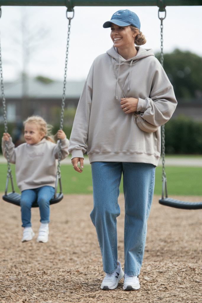 Why it works: This is “comfy chic winter outfits” energy without sloppiness. Barrel jeans feel on-trend; hoodie keeps you warm at the swings.
