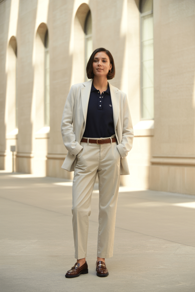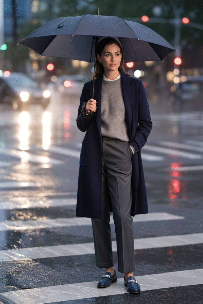 - Hunt tailored classics: Navy blazers, camel coats, tweeds, leather loafers.