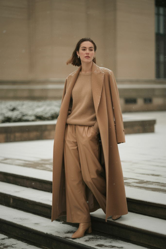 - If camel near the face washes you out, pivot to ivory sweater under the coat.