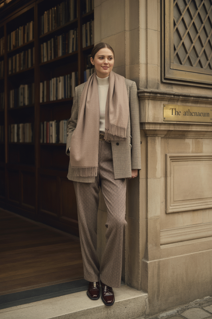 Formula: Tweed jacket + fine-gauge roll-neck or oxford + pleated wool trousers + brogues + cashmere scarf.