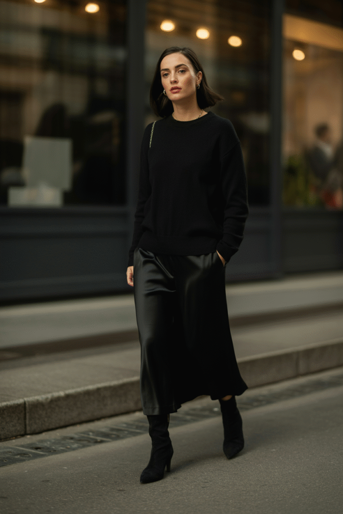 Formula: Black cashmere crew + silk skirt or tuxedo trouser + suede boots/pumps + structured clutch + pearl or gold studs.