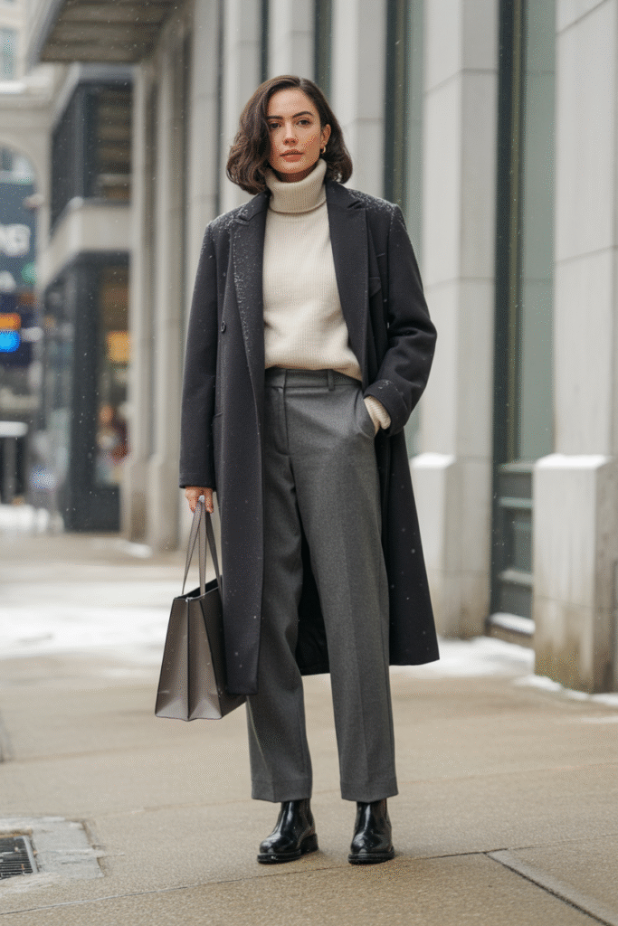 Formula: Tailored wool coat + cashmere turtleneck + pressed trouser + sleek Chelsea boot + leather tote or brief.