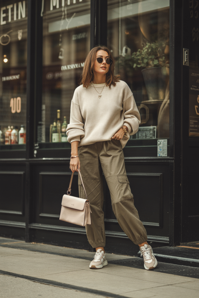 - Cashmere sweaters with cargo pants
