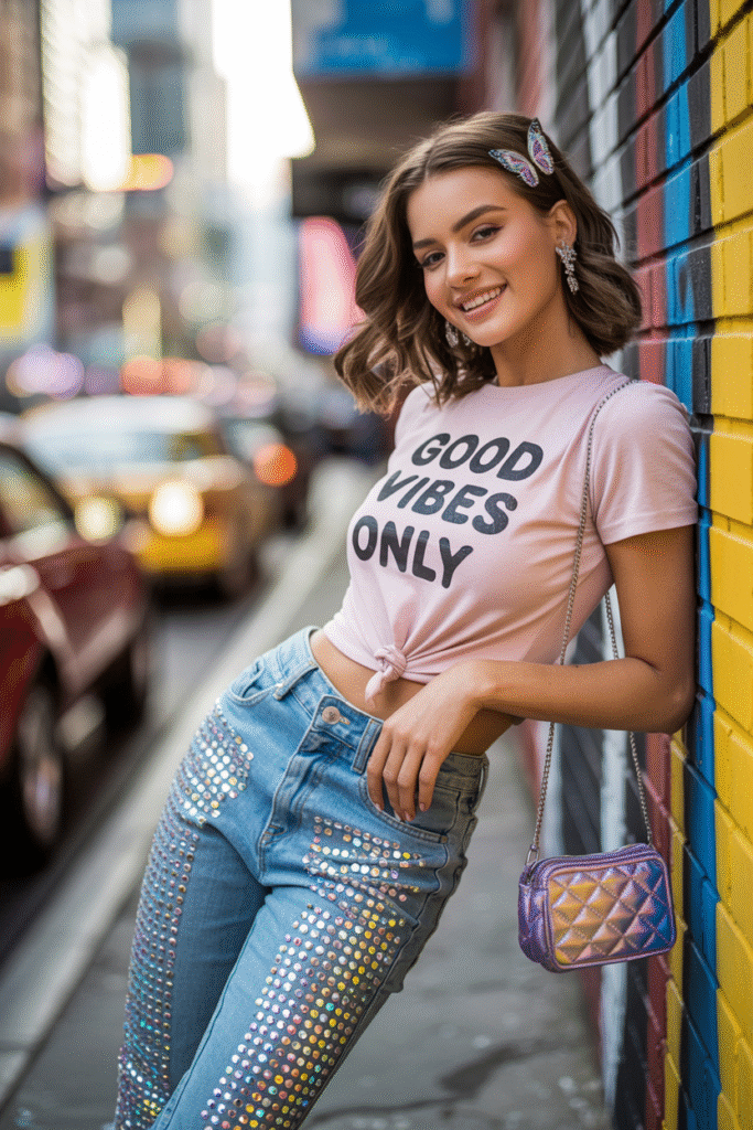 Did you think low-rise jeans were dead? Same. But 2025 said “plot twist.” The new Y2K wave isn’t just denim—it’s rhinestones, butterfly clips, and bedazzled everything.